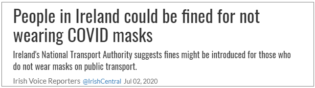 爱尔兰规定,从7月13日起人们乘坐公共交通工具必须戴口罩,违规者将面临2500欧元罚金或半年徒刑。此前,交通部长谢恩·罗斯在接受RTE《早间爱尔兰》采访时表示,随着限制的放松,公共交通将面临压力。他说,公共交通的容量将在未来几周内增加到最大,但为了保护人们的健康,将强制要求人们佩戴口罩戴。