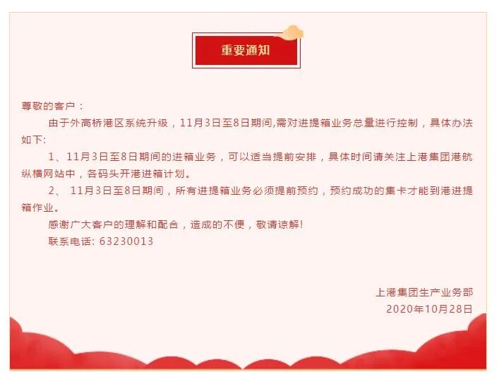 2、11月3日至8日期间,所有进提箱业务必须提前预约,预约成功的集卡,才能到港进提箱作业。