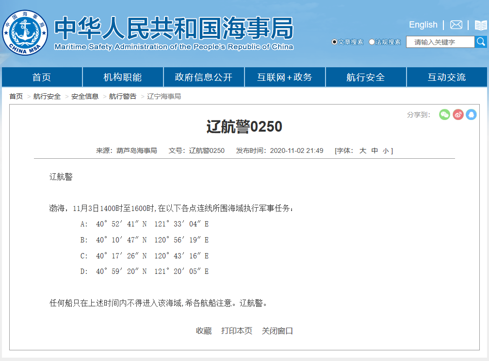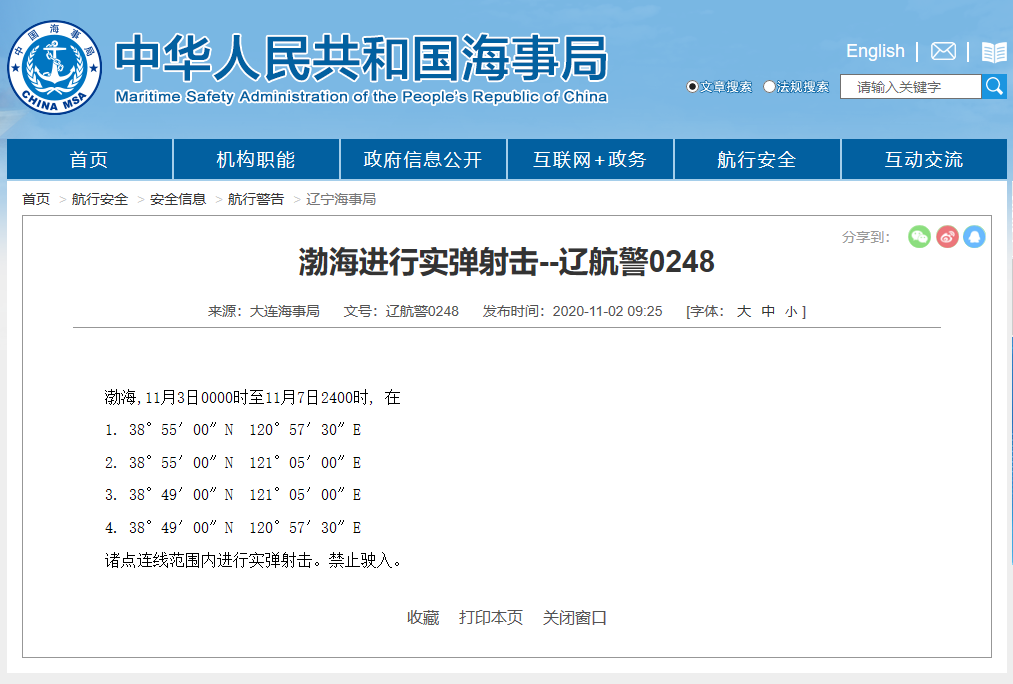 11月2日起渤海部分海域将执行军事任务和实弹射击。可能会对部分港口船期造成一定影响,有出货计划的货主货代请注意。
