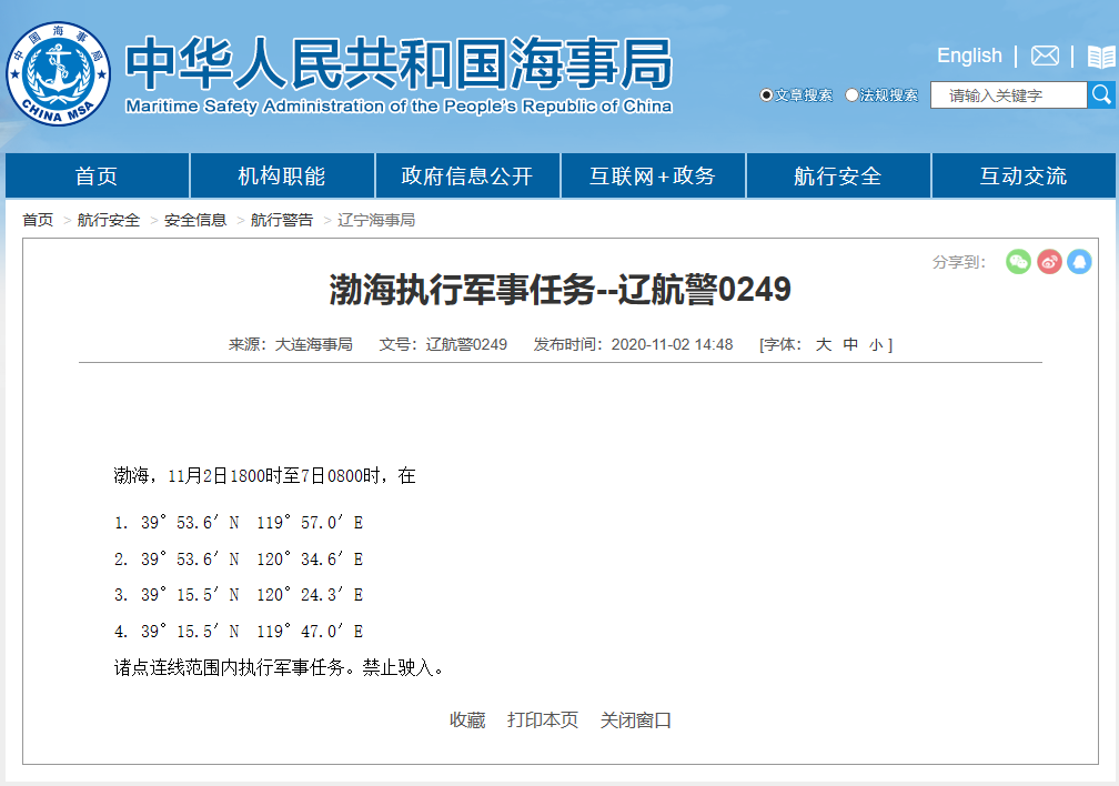 大连海事局发布:辽航警0248,渤海,11月3日0000时至11月7日2400时,在
