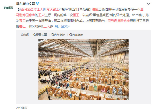 此次组织罢工也是该工会与亚马逊德国分公司围绕更好的薪酬和工作条件展开的长期斗争的一部分。该工会还指出,今年3月份亚马逊德国分公司计划为工人发放的疫情奖金在5月份再次被取消。