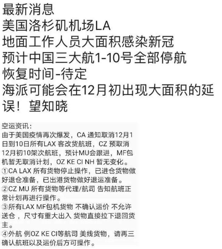 据了解,由于美国LAX疫情加剧,CA已经通知取消全部12月1-10日的客机货班和客改货,CZ已经跟进取消了10架以上航班,MU预计也会跟进。